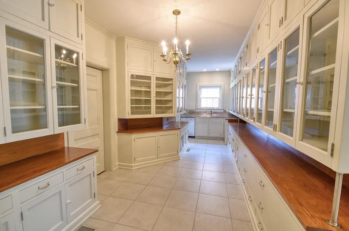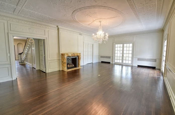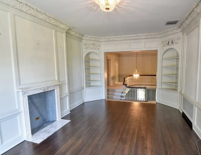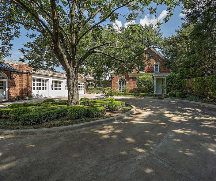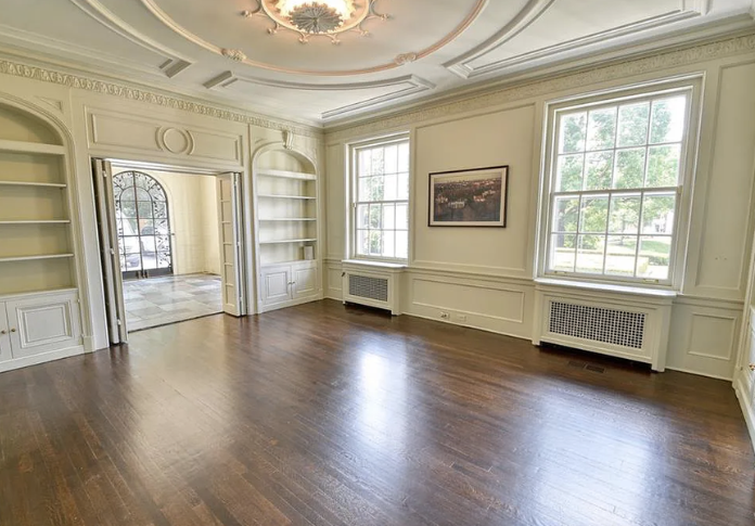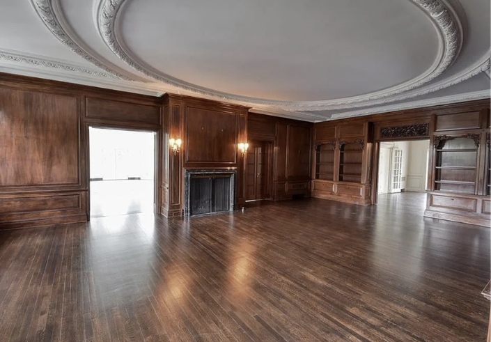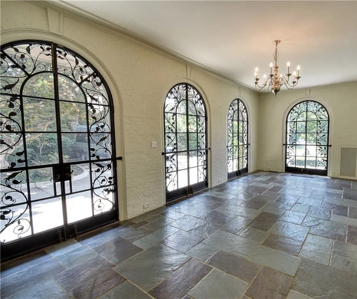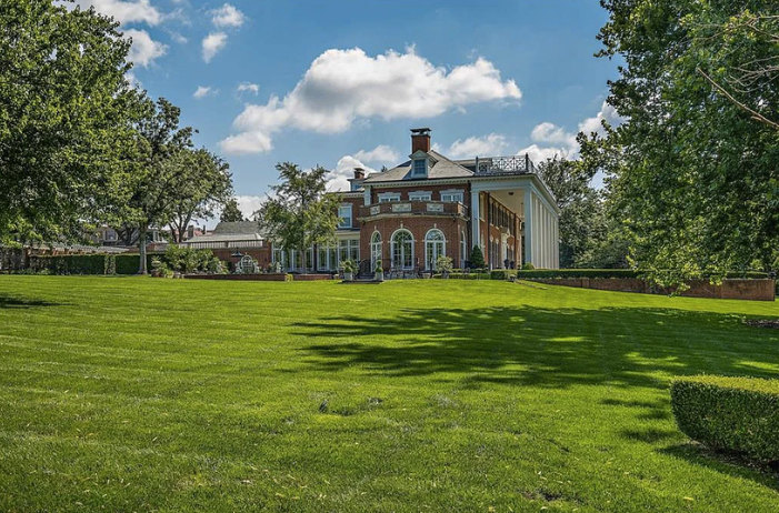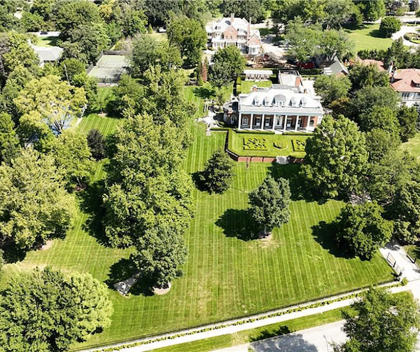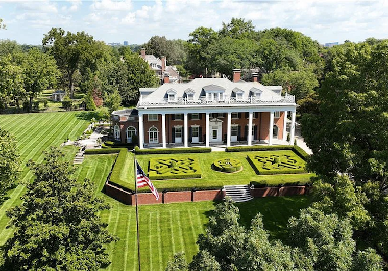 Inside, the home is meticulously maintained with much of its original details intact, including ornate plaster moldings, Missouri walnut trim, and paneling with carved accents. A formal living room and dining room, updated kitchen, butler’s pantry, library, office, solarium, enclosed porch, and a breakfast room with the original custom ironwork make up the home’s main floor. The upper floors include seven bedrooms, six full baths, a large family room, and a walk-in cedar closet. A garage and indoor/outdoor dog kennel are attached to the main house, and next door is a converted carriage house that now serves as a guest house.