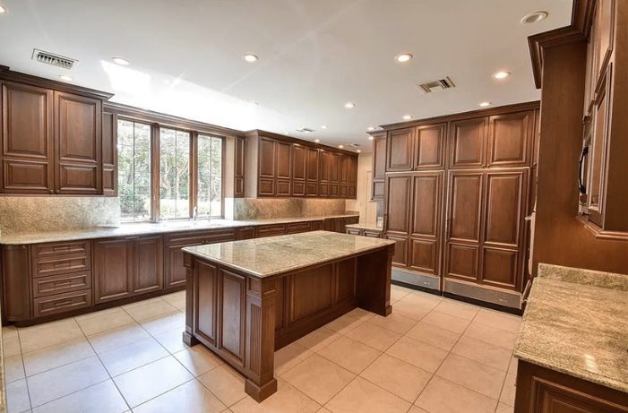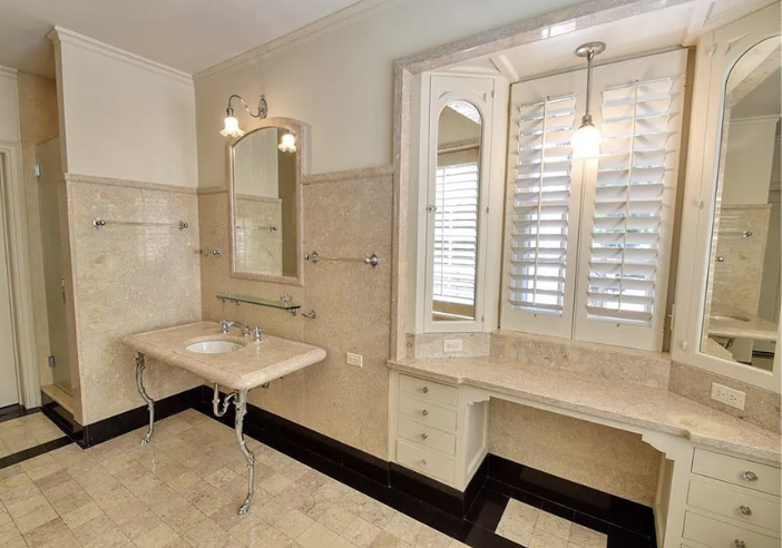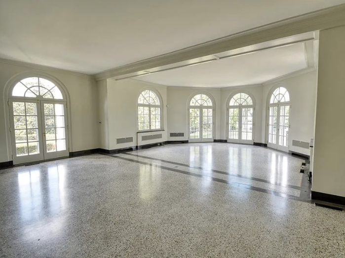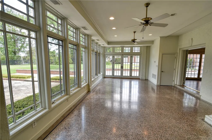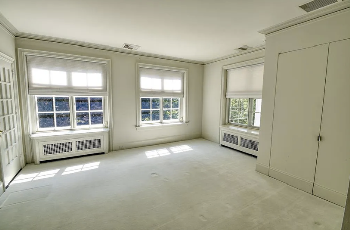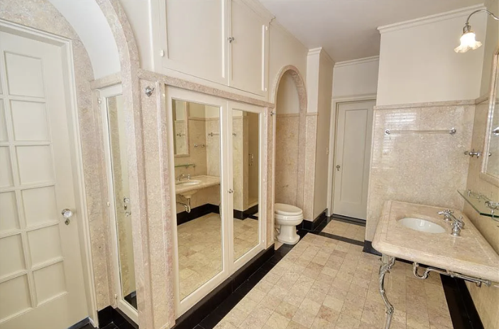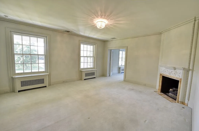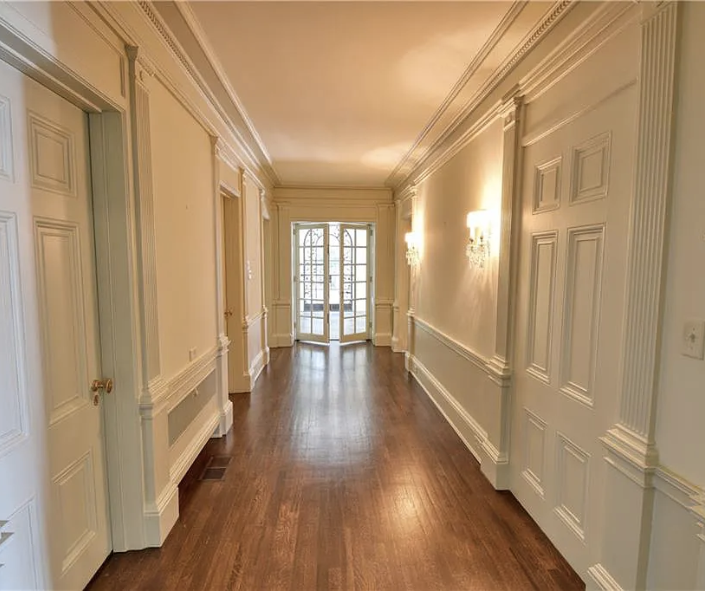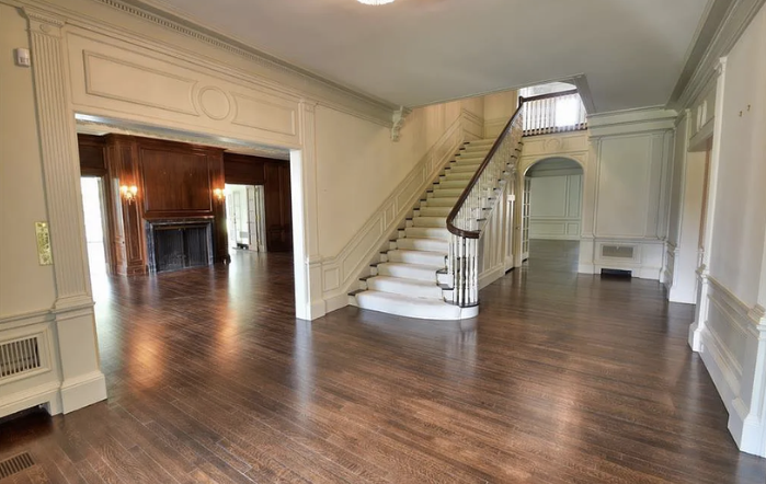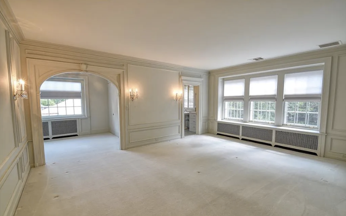 Inside, the home is meticulously maintained with much of its original details intact, including ornate plaster moldings, Missouri walnut trim, and paneling with carved accents. A formal living room and dining room, updated kitchen, butler’s pantry, library, office, solarium, enclosed porch, and a breakfast room with the original custom ironwork make up the home’s main floor. The upper floors include seven bedrooms, six full baths, a large family room, and a walk-in cedar closet. A garage and indoor/outdoor dog kennel are attached to the main house, and next door is a converted carriage house that now serves as a guest house.
