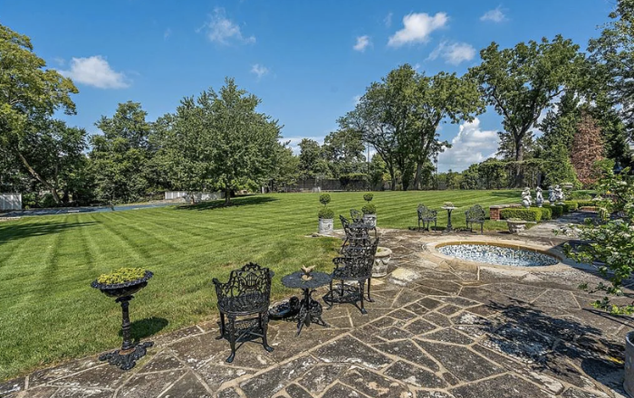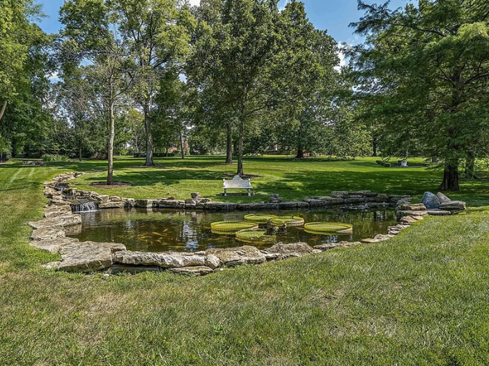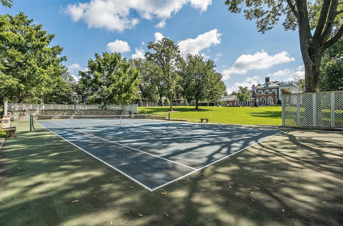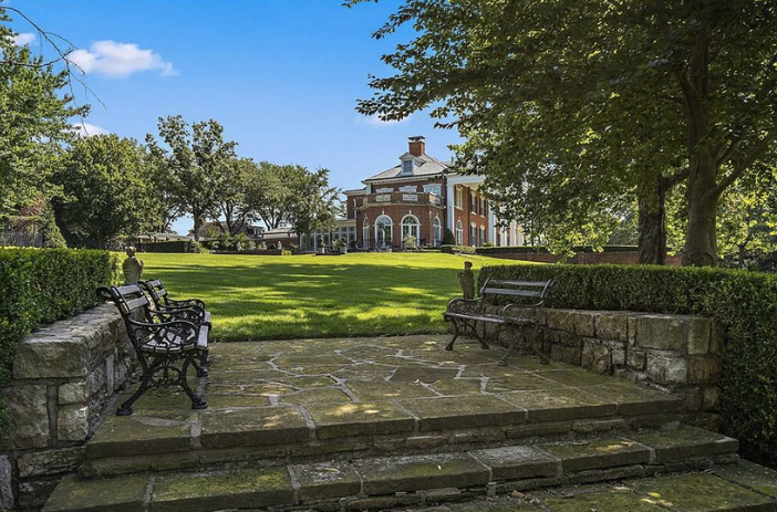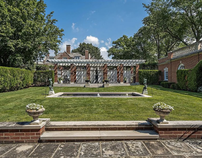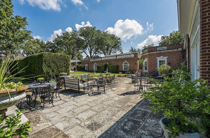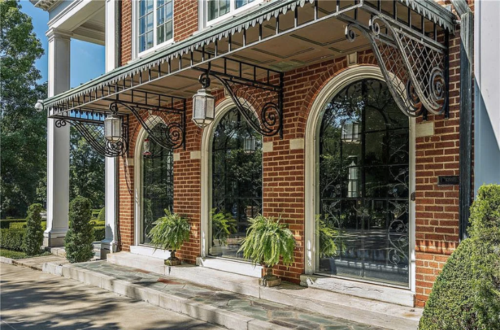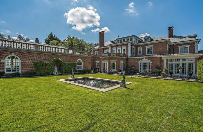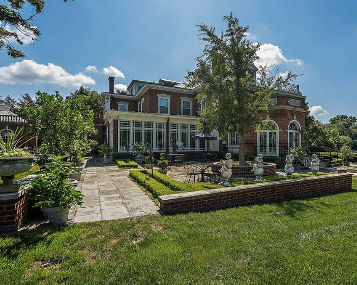 The two-and-a-half-story home has a red brick exterior with limestone trim and a slate roof. The first, and most striking element when approaching the home is the full-width, two-story porch with handsome classical pillars. There are several patios around the house overlooking the grounds, which include formal gardens complete with fountains, ponds, and a full-size tennis court.